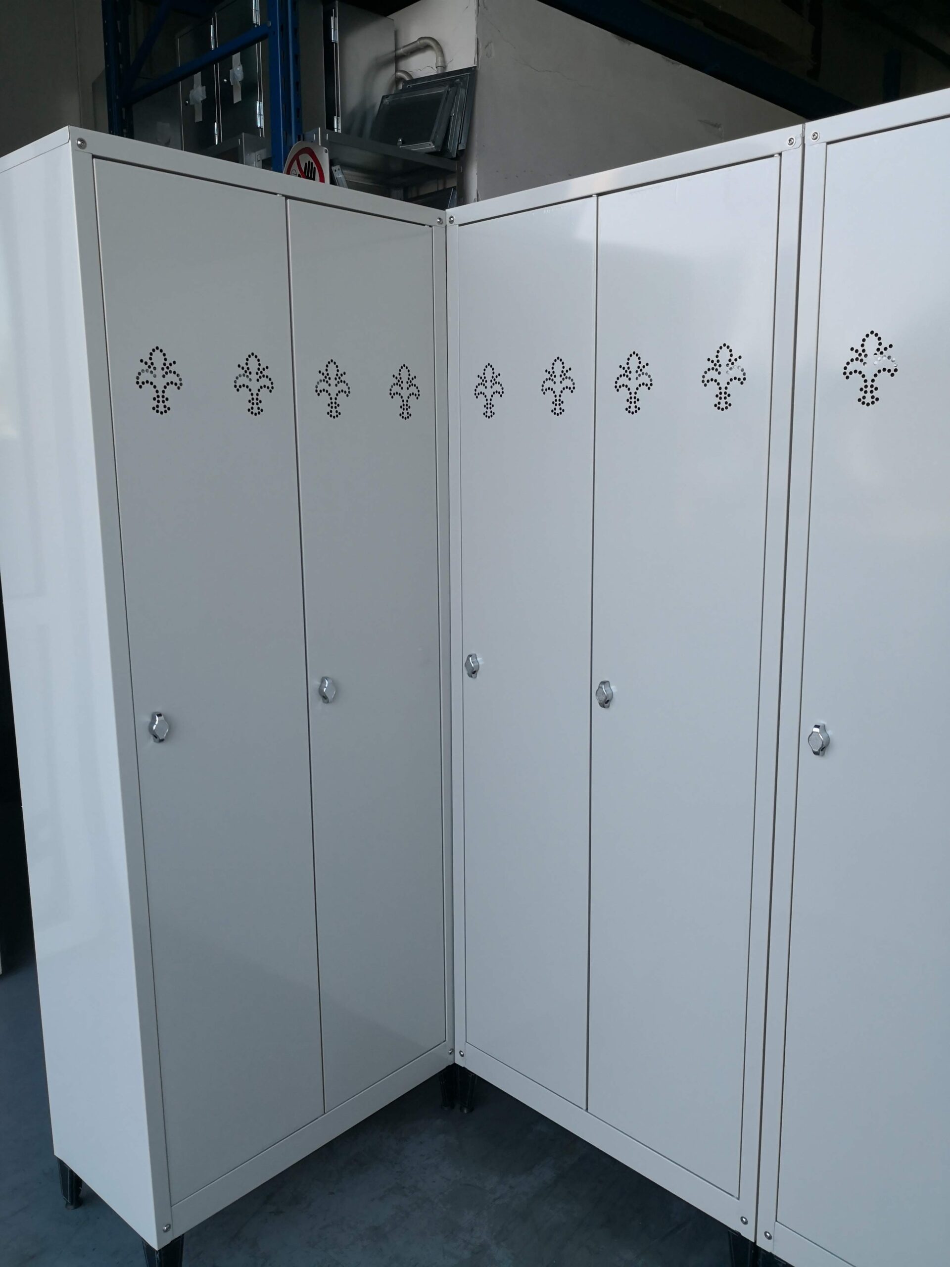 Gli armadietti sono realizzati in lamiera zinco preverniciata biancogrigia (spessore 6/10) e vengono forniti montati.